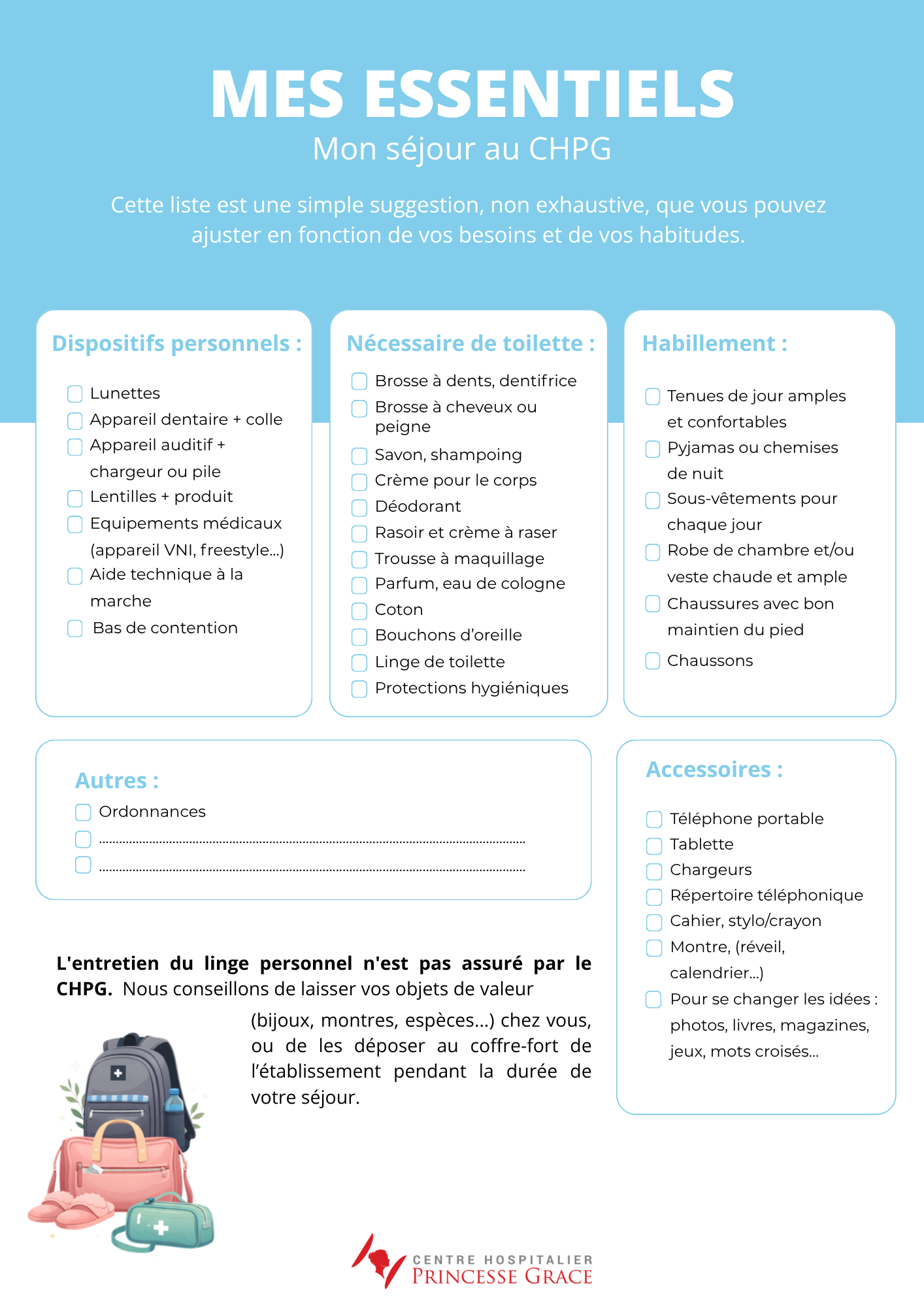 Le livret d’accueil vous guidera dans la préparation de votre venue et le déroulé de votre séjour au Centre Hospitalier Princesse Grace. Vous y retrouverez toutes les informations pratiques et les formalités de votre admission jusqu’à votre sortie.