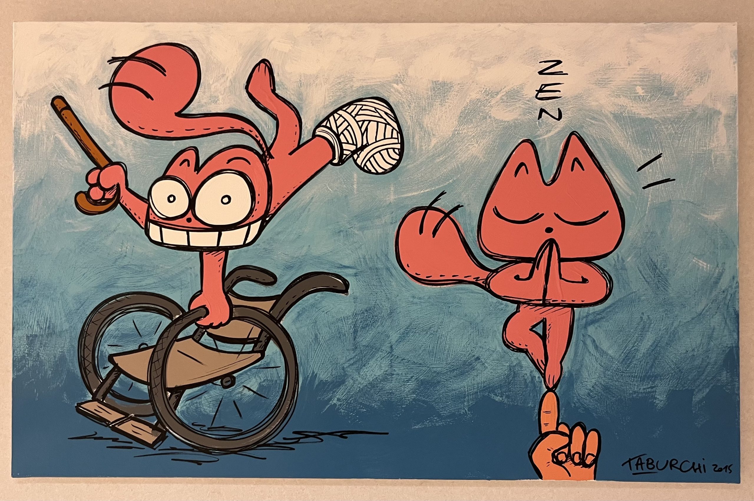 Dans cette œuvre exposée dans le service de Médecine Physique et Réadaptation, l’artiste Jérémy Taburchi met en scène son célèbre alter-ego, le Chat Rose, figure emblématique depuis plus de vingt ans. Sur le tableau, deux chats attirent immédiatement l’attention : l’un exécute une figure acrobatique sur un fauteuil, tandis que l’autre adopte une posture de yoga.